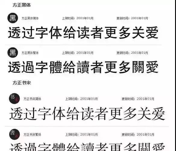 實在無法舍棄,就使用方正黑體、方正書宋、方正仿宋和方正楷體這幾款免費商用的字體系列吧。